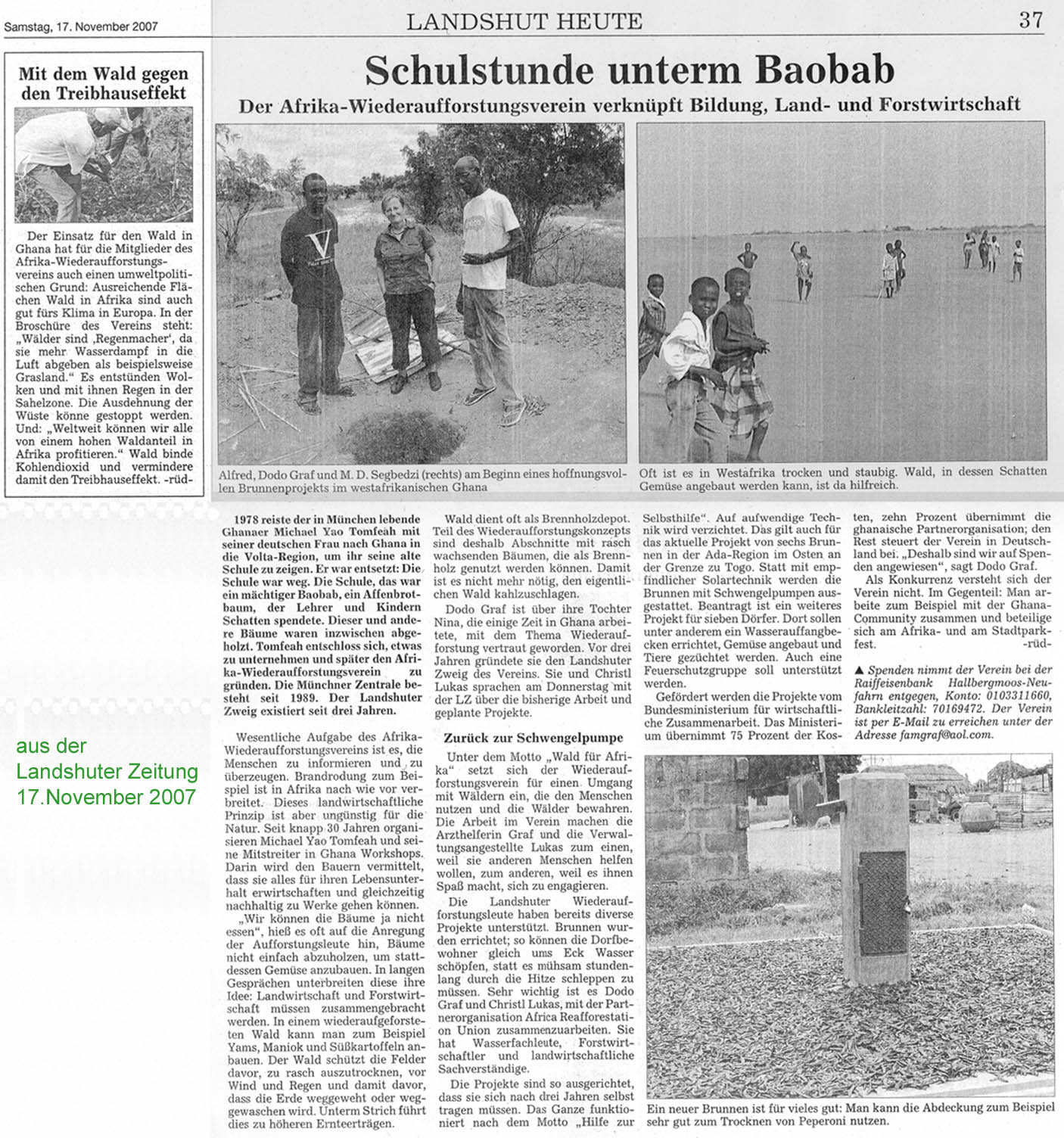 In einem ganzseitigen Artikel berichtete die Landshuter Zeitung am Wochenende 17./18. November 2007 über die Projekte und Aktivitäten des Afrika Wiederaufforstungsvereins e.V.: |